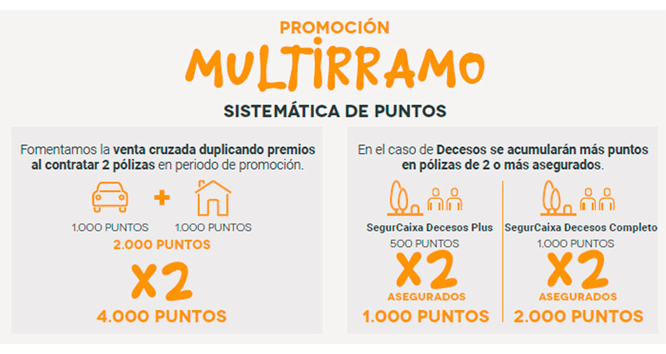 En Multirramo, por la contratación de dos o más productos en promoción, se multiplicará x2 los puntos totales. Hay excepciones como en la gama de Decesos. Los productos de Decesos con 2 o más asegurados ya incorporan un multiplicador propio. Por tanto, no se aplicará un segundo multiplicador en los casos en los que